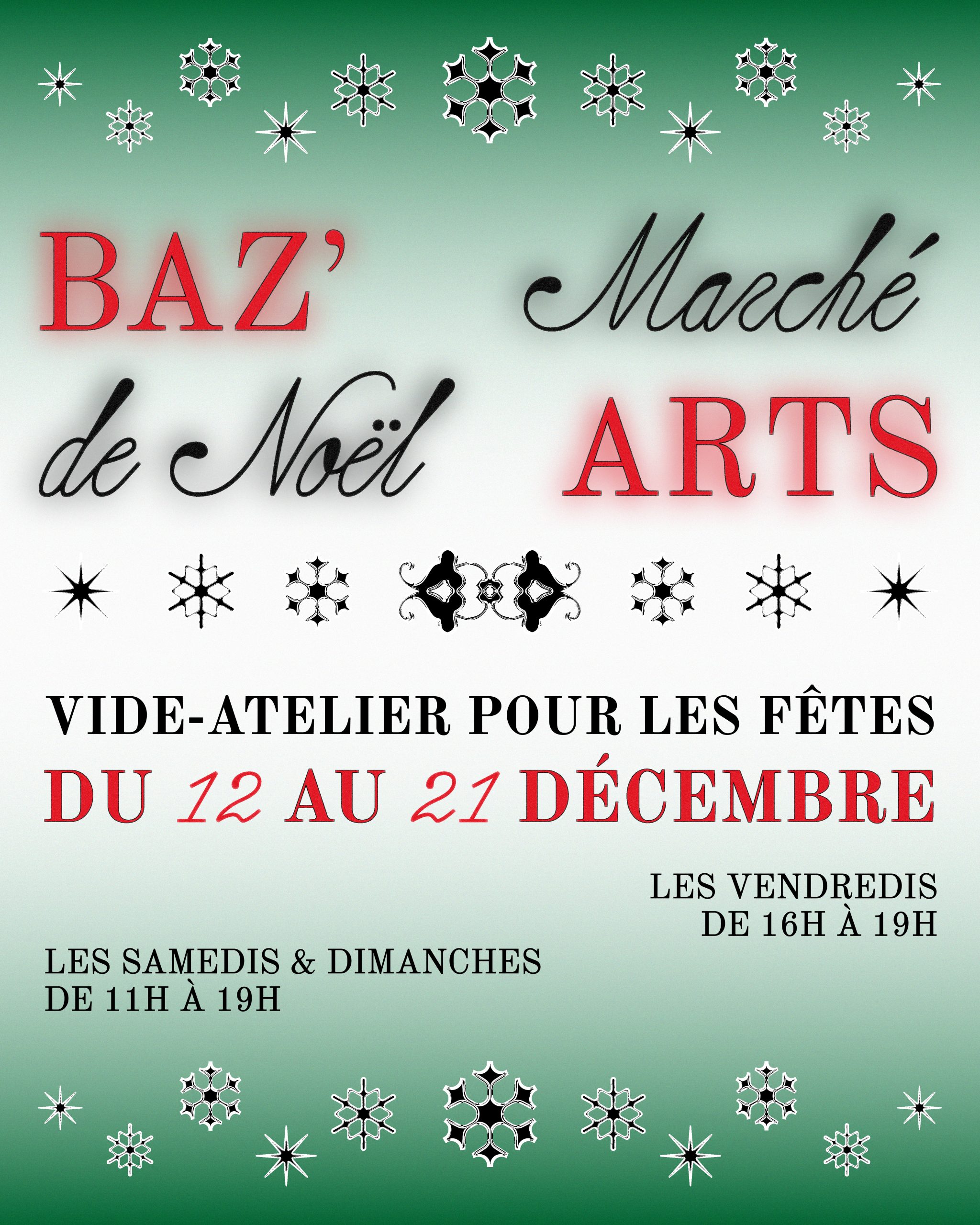 Le Baz’arts – Marché de Noël 2025 – se déroule les Vendredi 12, 19 de 16 à 19h, les Samedi 13, 20 et Dimanche 14, 21 de 11h à 19h.